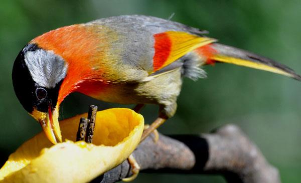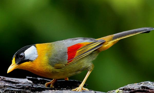 頭體長14-18cm。頭頂黑色,耳羽銀灰色,前額橙黃色。外側(cè)飛羽橙黃色,基部朱紅色,極為鮮艷、醒目。尾圓形,尾上、尾下覆羽朱紅色,尾暗灰褐色,外側(cè)尾羽橙黃色,其余上體橄欖綠或橄欖黃色。喉、胸朱紅色或黃色,嘴橙黃色。虹膜紅褐色或褐色,嘴橙黃色或黃色,腳趾黃褐色、褐色或肉黃色。與紅嘴相思鳥同科同屬,但區(qū)別明顯,野外不難識別。