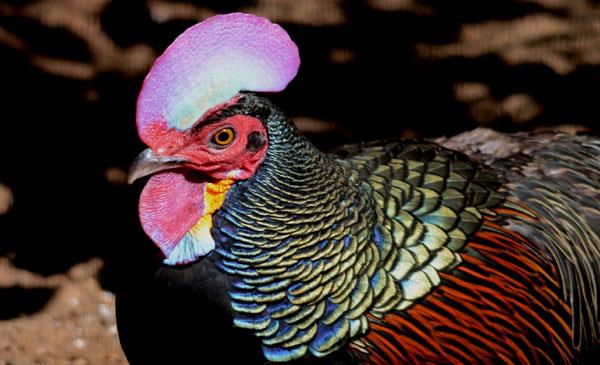 兩性異形,雄雞羽毛的顏色主要是綠色和黑色,與其他原雞品種相較,有很多獨特之處:喉部下有一個三色肉綴,有一個帶凹口的羽冠,羽毛幾乎呈方形。頭頂部主要是淡藍(lán)色,在頂峰部分變成紫紅色。