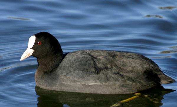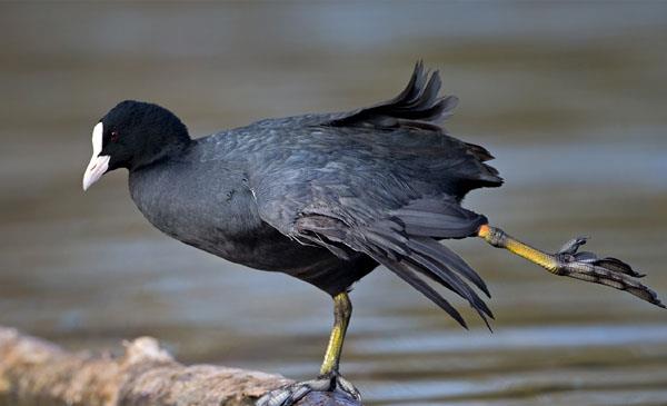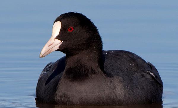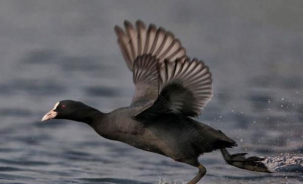 體長35-43cm,重430-840g。中型游禽,像小野鴨,常在開闊水面上游泳。全體灰黑色,具白色額甲,趾間具瓣蹼。嘴長度適中,高而側(cè)扁。頭具額甲,白色,端部鈍圓。跗跖短,短于中趾不連爪。趾均具寬而分離的瓣蹼。通常腿、趾均細(xì)長,有后趾,用來在漂浮的植物上行走,趾兩側(cè)延伸成瓣蹼用來游泳。虹膜紅褐色。嘴端灰色,基部淡肉紅色。腿、腳、趾及瓣蹼橄欖綠色,爪黑褐色。