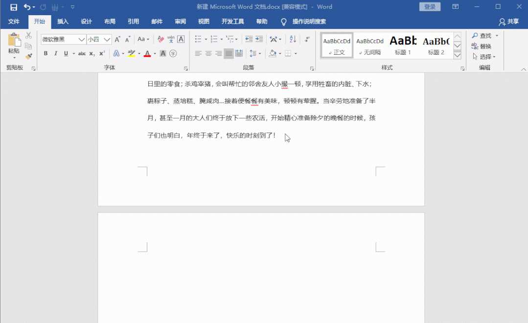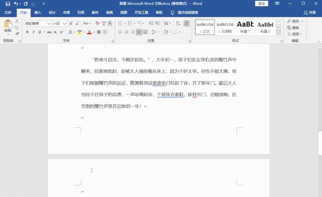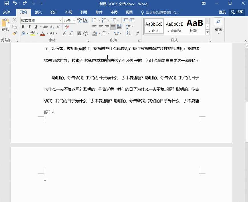 當(dāng)空白頁在文檔的中間,就有些麻煩了,這時候不要一直按刪除鍵。將光標(biāo)移動到空白頁上方的最后一個字后面,然后按住【Shift】選中整個空白頁,最后按下【Delete】,這樣空白頁就被刪除了。