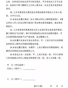 一、離崗創(chuàng)業(yè)扶持期為2年:從2016年 月 日起到2018年 月 日止。 二、離崗創(chuàng)業(yè)期間,停發(fā)乙方的全部工資待遇,不參加正常晉檔晉級(jí)和晉職。