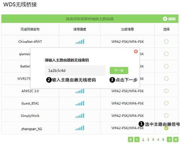 6、路由器會自動掃描出周邊的無線網(wǎng)絡(luò)信號,選擇你的主路由器的,輸入主路由器的無線密碼,下一步。