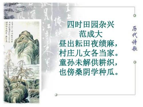 日長(zhǎng)籬落無人過, 唯有蜻蜓蛺蝶飛。 四時(shí)田園雜興 (二) 晝出耘田夜績(jī)麻, 村莊兒女各當(dāng)家。