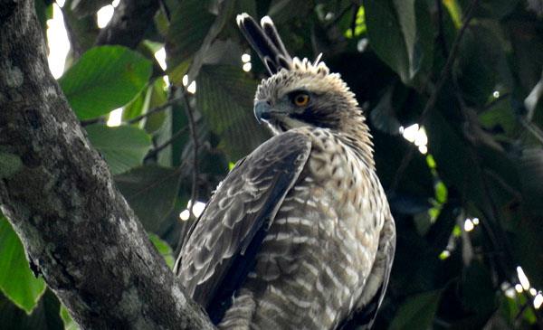 體長(zhǎng)66-84cm,翼展134-175c。成年鷹雕的上半身呈棕色,下體有白色紋。翅膀很寬,在飛行時(shí)呈V型,未成熟的鷹雕通常擁有白色的頭。最明顯的特征是頭后有長(zhǎng)的黑色羽冠,比棕腹隼雕的羽冠要顯著得多,常常垂直地豎立于頭上。跗跖上被有羽毛,同覆腿羽一樣,都具有淡褐色和白色交錯(cuò)排列的橫斑。飛翔時(shí)翅膀顯得十分寬闊,翅膀下面和尾羽的下面的黑色和白色交錯(cuò)的橫斑極為醒目。虹膜金黃色,嘴黑色,蠟?zāi)せ液谏?,腳和趾黃色,爪黑色。