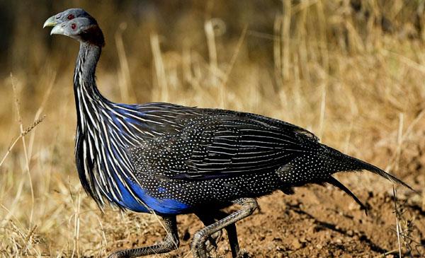 頭體長(zhǎng)61-70cm,重1.1-1.8kg。成鳥(niǎo)頭和頸部裸露呈黑藍(lán)色,體結(jié)實(shí),喙短,呈圓錐形,適于啄食植物種子。腳強(qiáng)健,具銳爪,善于行走和掘地尋食。全身的羽毛由鈷藍(lán)色、淡紫色、黑色和白色混合,豐富多彩,絢麗異常。長(zhǎng)長(zhǎng)的腿,在灌木林冠間奔跑,可以持續(xù)50-100m。雖然沒(méi)有其他珠雞的鳳頭,但是這個(gè)物種因?yàn)樗L(zhǎng)長(zhǎng)的脖子和頭部,看起來(lái)特別像一只禿鷲,因經(jīng)得名鷲珠雞。