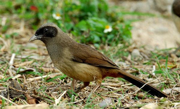 體長27-32cm,重100-140g。頭頂至后頸褐灰色,額、眼先、眼周、頰、耳羽黑色,形成一條圍繞額部至頭側(cè)的寬闊黑帶。背暗灰褐色至尾上覆羽轉(zhuǎn)為土褐色。頦、喉褐灰色,胸、腹棕白色,尾下覆羽棕黃色。尾羽暗棕褐色,外側(cè)尾羽先端黑褐色。翼上覆羽和最內(nèi)側(cè)飛羽與背同色,其余飛羽褐色,外翈羽緣黃褐色。虹膜棕褐色或褐色,嘴黑褐色,腳淡褐色。