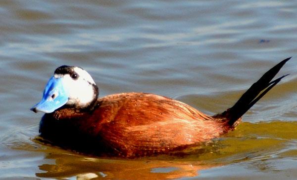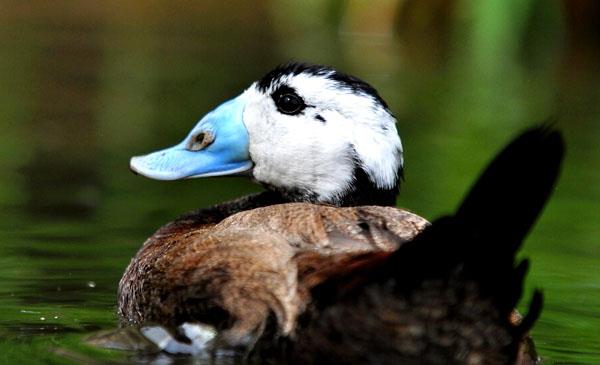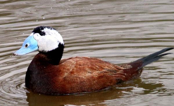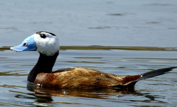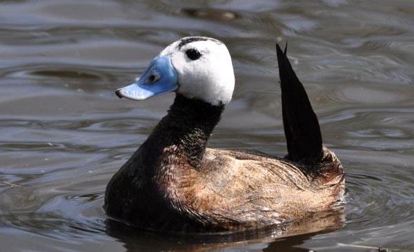 白頭硬尾鴨:別名,為雁形目、鴨科、硬尾鴨屬鳥類,原產(chǎn)于歐洲(東南)、亞洲(西北)、非洲(北部),我國新疆西北部偶有繁殖。野生于開闊平原地區(qū)的大型淡水湖泊或鹽水湖泊和沿海地帶。1769年命名。在新疆為夏候鳥,在湖北為偶見迷鳥。全球性易危,數(shù)量極為稀少。據(jù)濕地國際組織最新統(tǒng)計,全球數(shù)量僅為8000-13000只。除繁殖期外一般也很少鳴叫,活動時寂靜無聲。游水時,常把尾部高高翹起。